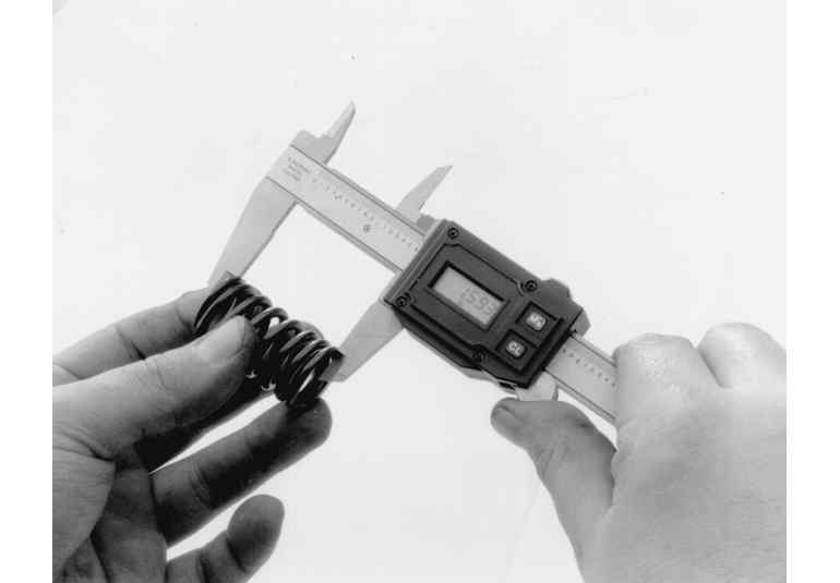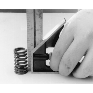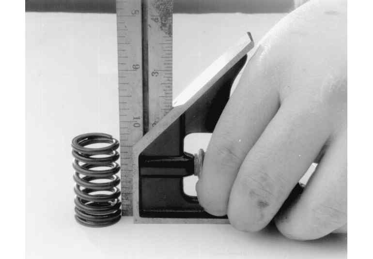 The first thing to check is the most obvious, broken springs. Next check the free length and squareness of each spring. If applicable, insure to distinguish between intake and exhaust springs. Use a ruler and/or carpenters square to measure the length. A carpenters square should be used to check the springs for squareness. If a spring pressure test gauge is available, check each springs rating and compare to the specifications chart. Check the readings against the specifications given. Any springs that fail these inspections should be replaced.