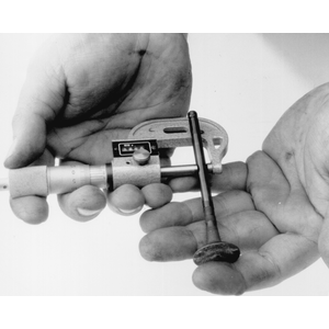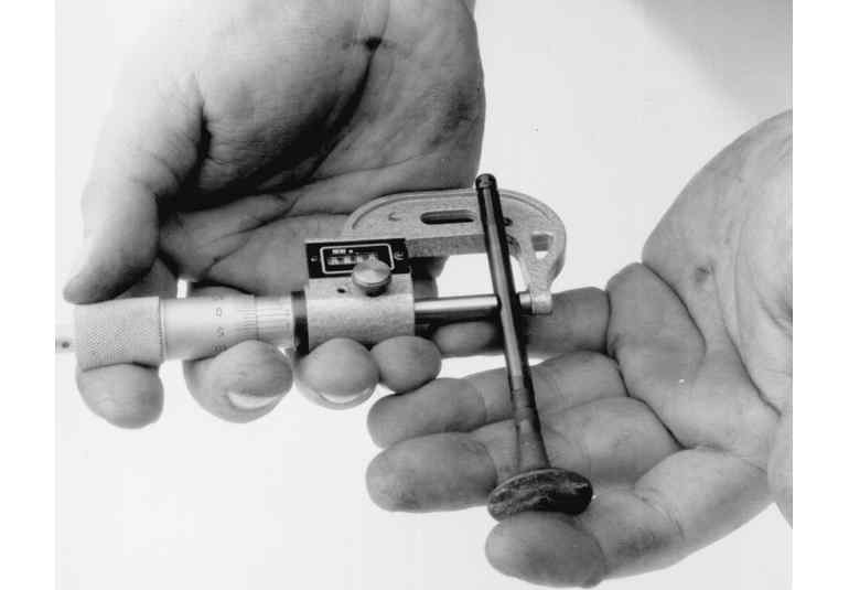 The first thing to inspect are the valve heads. Look closely at the head, margin and face for any cracks, excessive wear or burning. The margin is the best place to look for burning. It should have a squared edge with an even width all around the diameter. When a valve burns, the margin will look melted and the edges rounded. Also inspect the valve head for any signs of tulipping. This will show as a lifting of the edges or dishing in the center of the head and will usually not occur to all of the valves. All of the heads should look the same, any that seem dished more than others are probably bad. Next, inspect the valve lock grooves and valve tips. Check for any burrs around the lock grooves, especially if you had to file them to remove the valve. Valve tips should appear flat, although slight rounding with high mileage engines is normal. Slightly worn valve tips will need to be machined flat. Last, measure the valve stem diameter with the micrometer. Measure the area that rides within the guide, especially towards the tip where most of the wear occurs. Take several measurements along its length and compare them to each other. Wear should be even along the length with little to no taper. If no minimum diameter is given in the specifications, then the stem should not read more than 0.001 in. (0.025mm) below the specification. Any valves that fail these inspections should be replaced. Valve stems may be rolled on a flat surface to check for bends