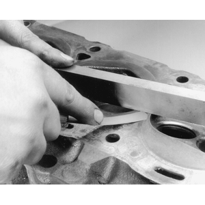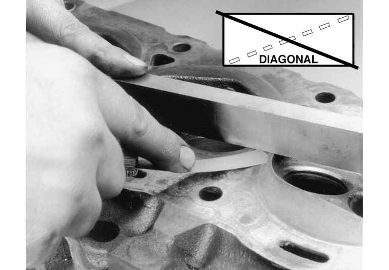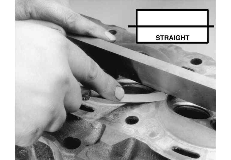 After you have cleaned the gasket surface of the cylinder head of any old gasket material, check the head for flatness. Check the head for flatness across the center of the head surface using a straigthedge and feeler gauge