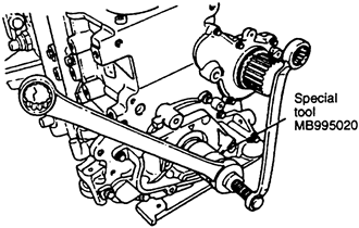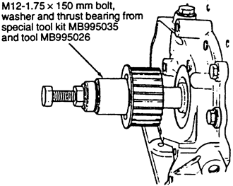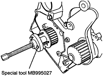 - Using tool MB995027 or equivalent, remove the crankshaft sprocket.