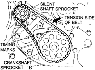 NOTE: There is a possibility to align all timing marks and have the oil pump sprocket and silent shaft out of time, causing an engine vibration during operation. If the following step is not followed exactly, there is a 50 percent chance that the silent shaft alignment will be 180 degrees off.