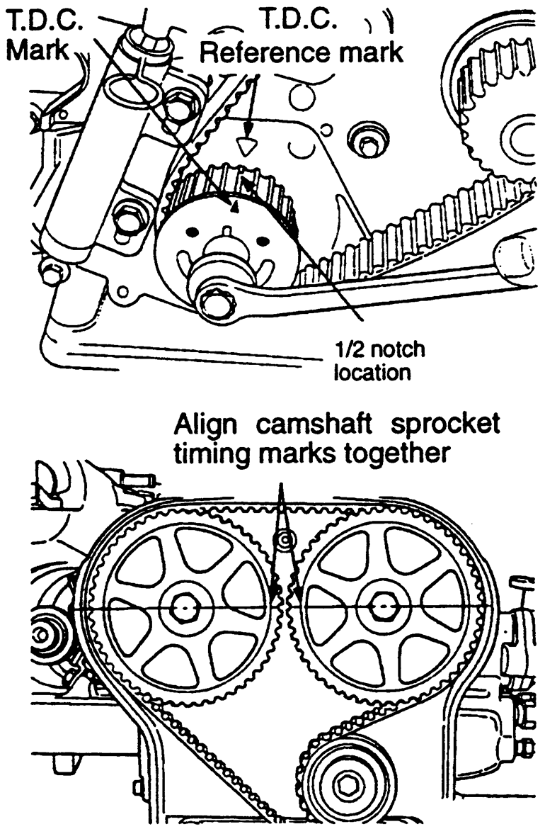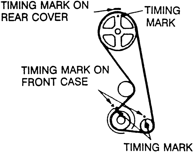 NOTE: Always rotate the crankshaft in a clockwise direction. Make a mark on the back of the timing belt indicating the direction of rotation so it may be reassembled in the same direction if it is to be reused.