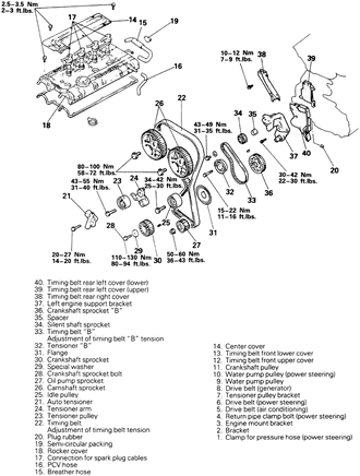 | Fig. 32: Exploded view of the inner (B) timing belt and related components — 2.4L engine |