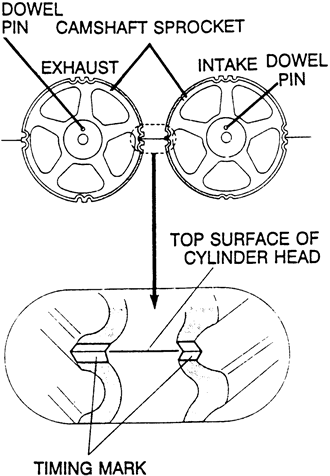 NOTE: Both camshaft sprockets are used for the intake and exhaust camshafts and are provided with 2 timing marks. When the sprocket is mounted on the exhaust camshaft, use the timing mark on the right with the dowel pin hole on top. For the intake camshaft sprocket, use the 1 on the left with the dowel pin hole on top.
