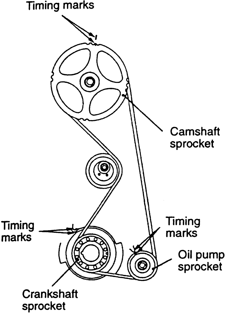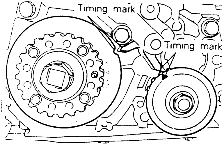 | Fig. 3: Timing belt timing mark alignment — 1.8L engine |