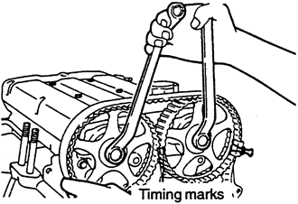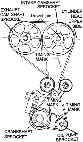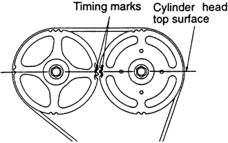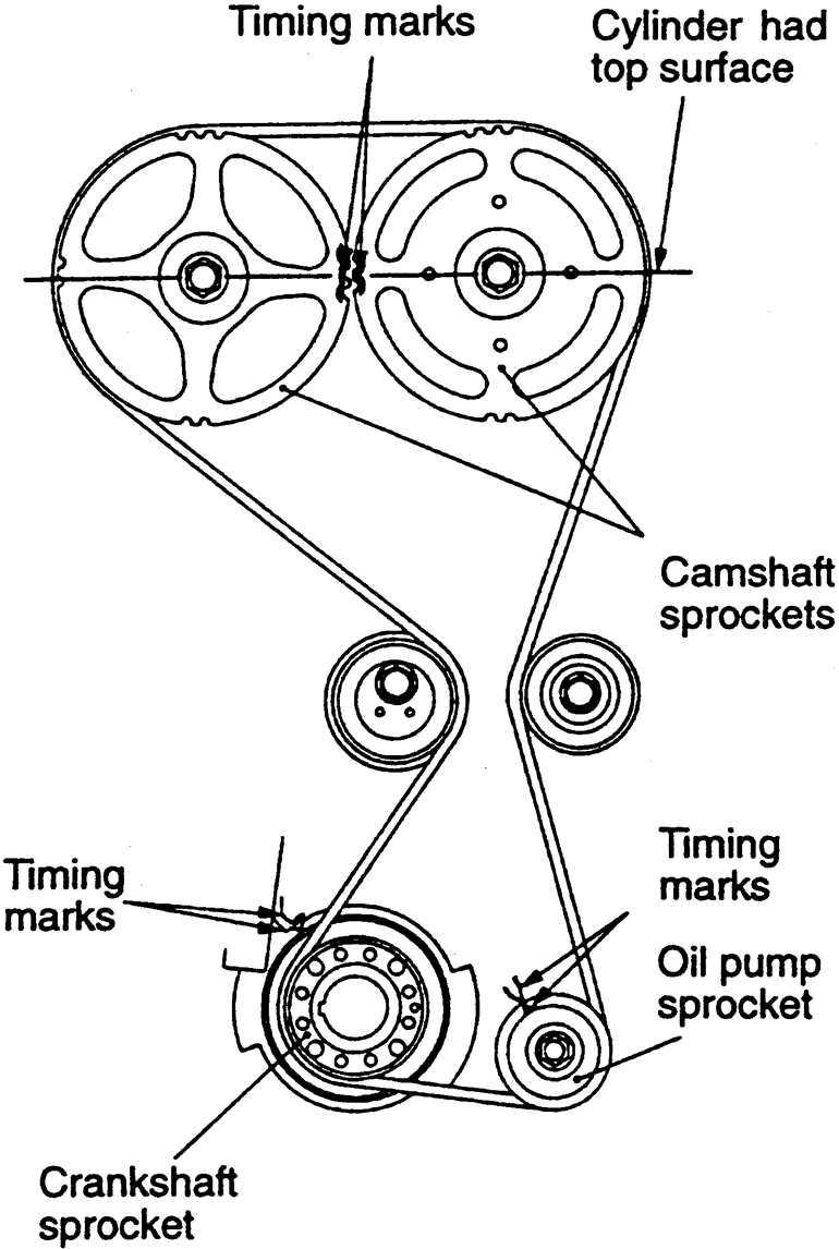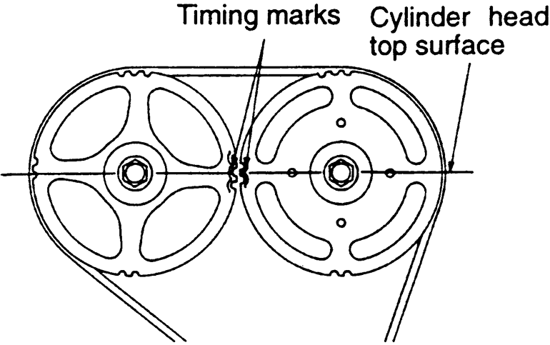 | Fig. 5: Align the camshaft sprocket so marks face each other and are in alignment with the top surface of the cylinder head — 1990–94 2.0L engine |