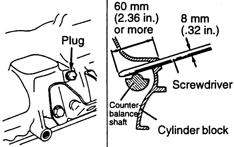 | Fig. 27: After the timing mark on the oil pump sprocket is lined up, remove the block plug and insert a screwdriver to assure proper alignment |
