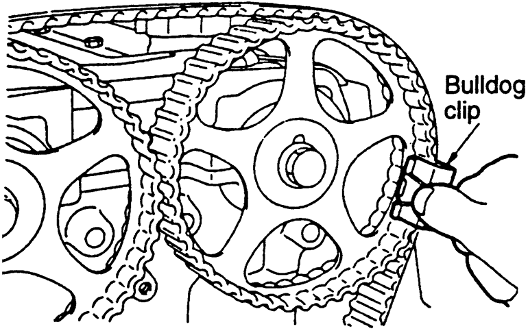 | Fig. 28: Keep the timing belt in position using a bulldog clip |