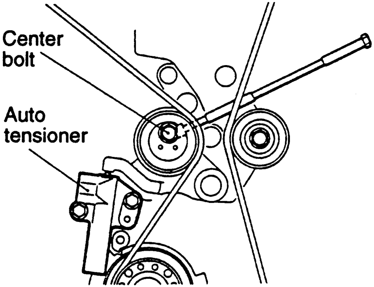 NOTE: When tightening the bolt of the tensioner, ensure that the tensioner pulley shaft does not rotate with the bolt. Allowing it to rotate with the bolt can cause excessive tension on the belt.