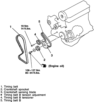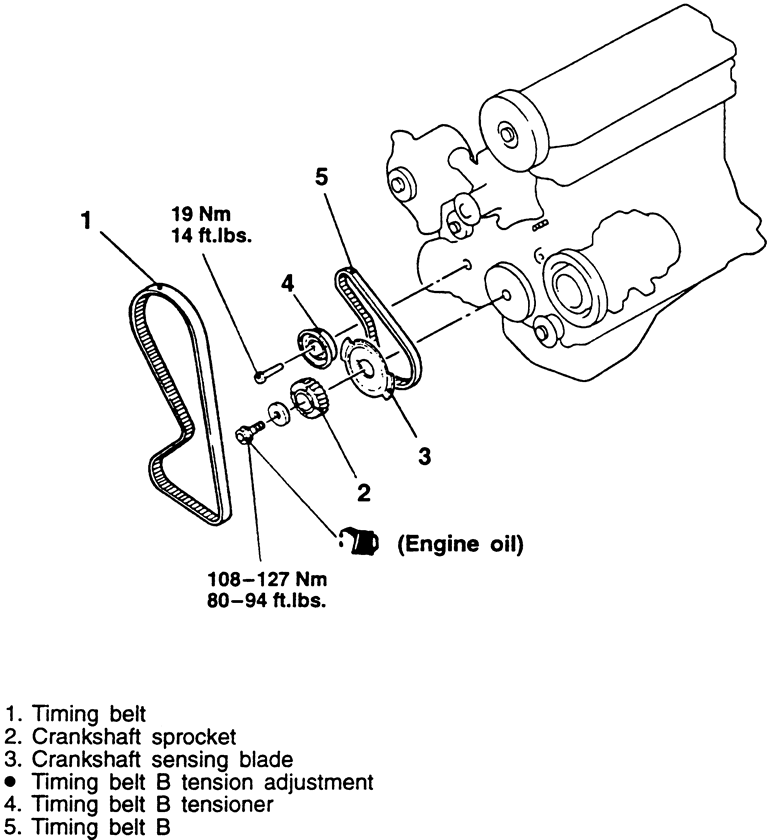 | Fig. 4: Exploded view of the timing belt and sprockets — 1990–94 2.0L engines |