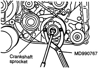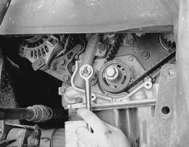| Fig. 33: You will probably have to use a special tool to remove the crankshaft pulley bolt — 2.4L engine |