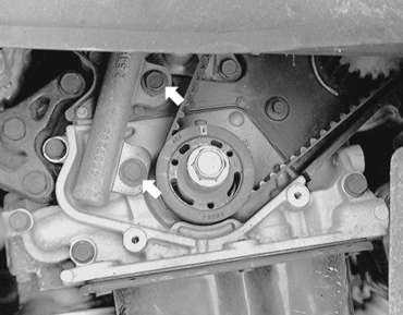 | Fig. 11: Loosen the timing belt tensioner bolts (see
