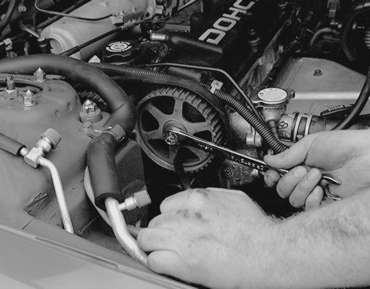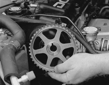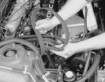 Inspect the timing belts in detail for any flaw or wear. Check the sprockets and tensioner for wear. The sprocket teeth should be well defined, not rounded and the valleys between the teeth should be clean. Turn both tensioner pulleys and check for any signs of bearing wear. If sprockets or pulleys show any sign of wear, they must be replaced.