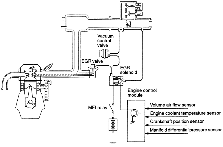The Exhaust Gas Recirculation (EGR) system is used to reduce Oxides of Nitrogen (NOx) in the engine exhaust. This is accomplished by allowing a predetermined amount of hot exhaust gas to recirculate and dilute the incoming air and fuel mixture. This process reduces peak flame temperature during combustion. The system uses a vacuum-controlled Exhaust Gas Recirculation (EGR) valve, in order to modulate exhaust gas flow from the exhaust manifold into the intake manifold.