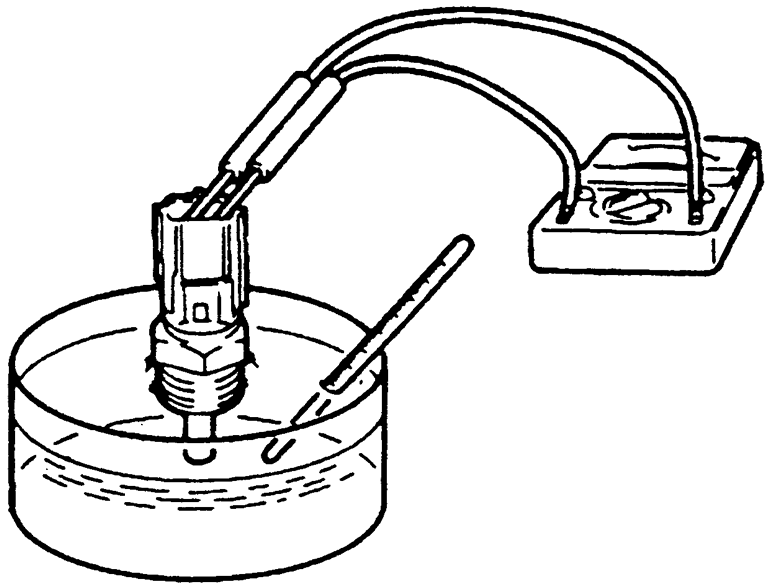 | Fig. 1: Measure resistance with the ECT sensor in a pan of water — except 1995–98 2.0L turbo engines |