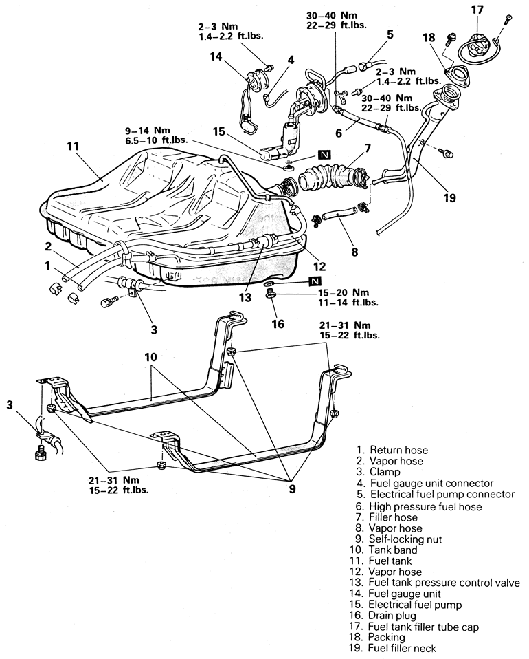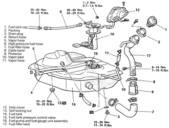 | Fig. 1: Exploded view of the fuel tank and related components — 1990–94 Front Wheel Drive (FWD) vehicle |