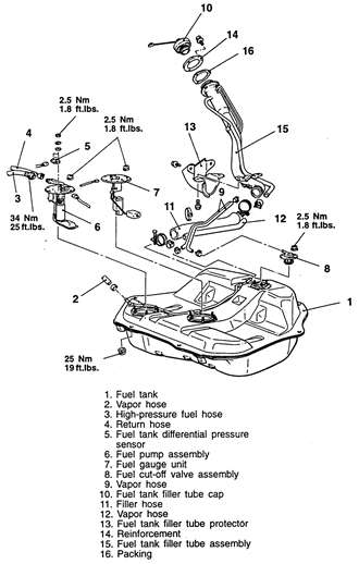 | Fig. 3: Exploded view of the fuel tank and related components — 1995–98 FWD |