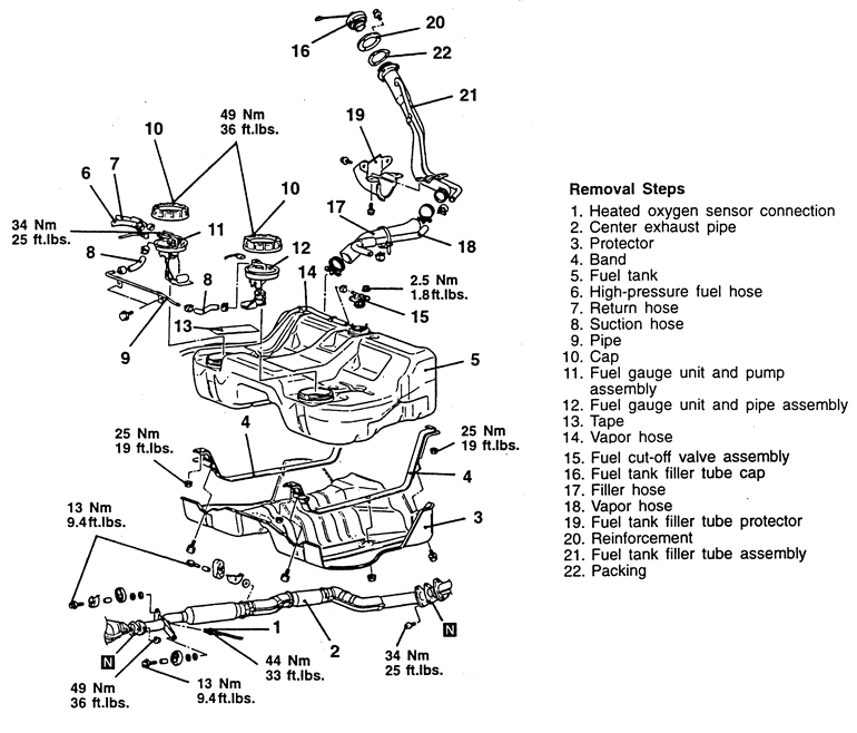 | Fig. 4: You have to remove some exhaust components for access to the fuel tank on 1995–98 AWD vehicles |