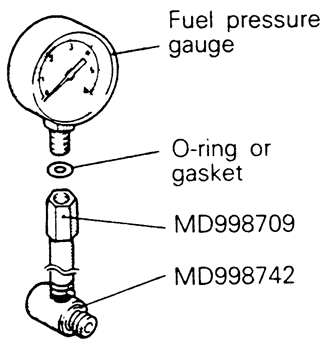 | Fig. 7: Install of the fuel pressure gauge on the fuel rail — 2.0L engine shown, others similar |