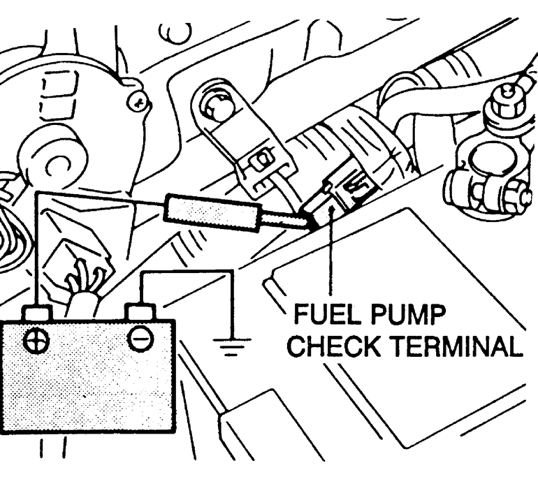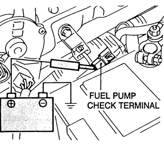 | Fig. 1: Checking fuel pump operation with battery voltage applied to the fuel pump check terminal — 1990–94 2.0L engine shown |