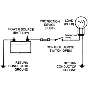 For any 12 volt, negative ground, electrical system to operate, the electricity must travel in a complete circuit. This simply means that current (power) from the positive terminal (+) of the battery must eventually return to the negative terminal (-) of the battery. Along the way, this current will travel through wires, fuses, switches and components. If, for any reason, the flow of current through the circuit is interrupted, the component fed by that circuit will cease to function properly.