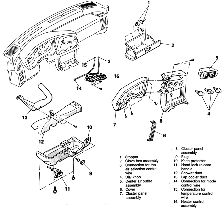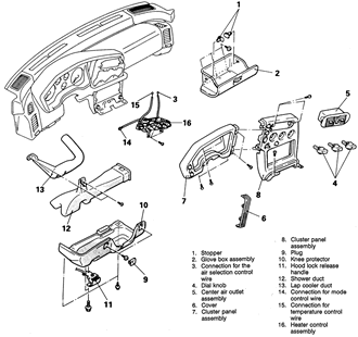 | Fig. 2: Exploded view of the heater control assembly and trim panels — 1990–94 vehicles |