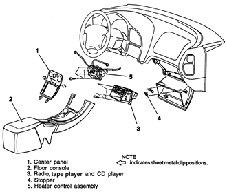 | Fig. 5: The floor console, trim panels and radio must be removed for access to the climate control panel — 1995–98 vehicles |