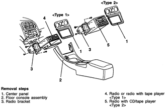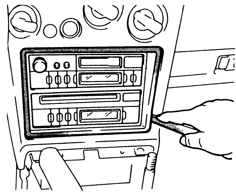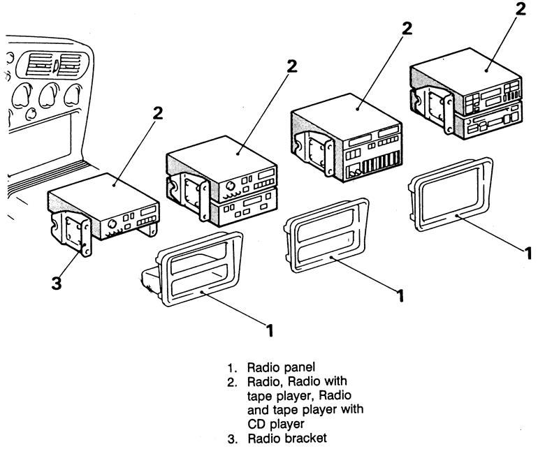 | Fig. 1: Exploded view of the radio, tape player or CD player removal — 1990–94 vehicles |