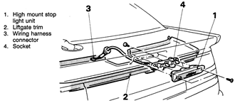 | Fig. 23: High-mount brake light mounting — early model vehicles with rear spoiler shown, late models similar |