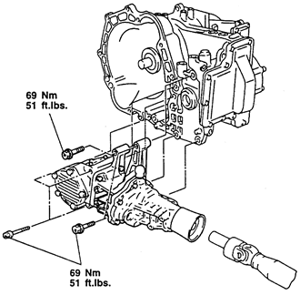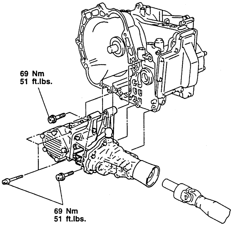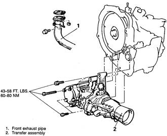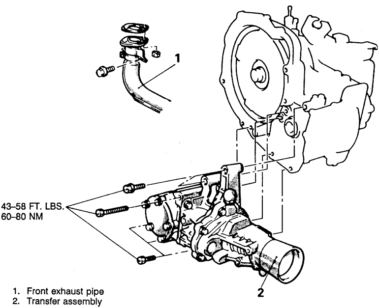 Tighten the transfer case to transaxle bolts to 40–43 ft. lbs. (55–60