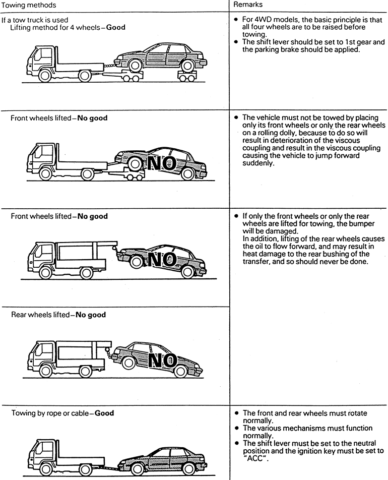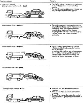 All Wheel Drive (AWD) vehicles should only be towed with all 4 wheels on the ground or lifted from the road surface. This means that the vehicle is to be towed either with flatbed equipment, with all wheels on dollies or flat towed. Damage to the viscous coupling may result if the vehicle is towed with only 2 wheels on the ground.