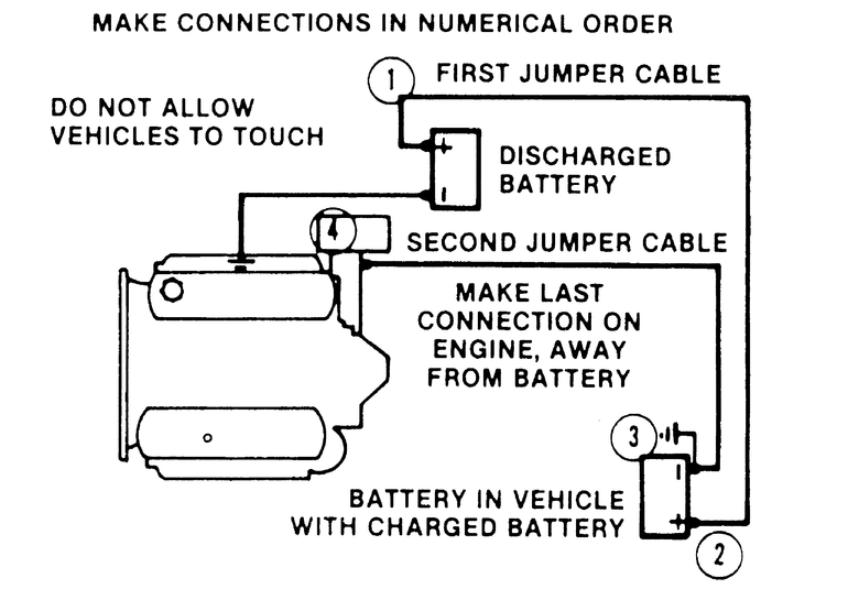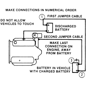 Whenever a vehicle is jump started, precautions must be followed in order to prevent the possibility of personal injury. Remember that batteries contain a small amount of explosive hydrogen gas which is a by-product of battery charging. Sparks should always be avoided when working around batteries, especially when attaching jumper cables. To minimize the possibility of accidental sparks, follow the procedure carefully.