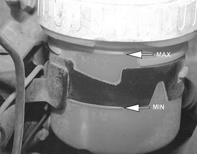 Observe the fluid level indicators on the master cylinder; the fluid level should be between the MIN and MAX lines.