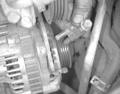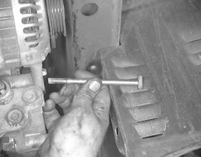 | Fig. 7: Remove the alternator adjusting bolt . . .