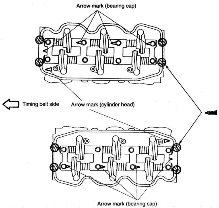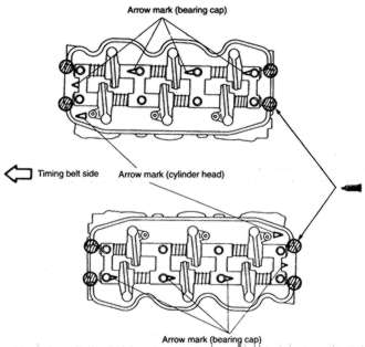 NOTE: Install the bearing caps according to the identification mark and cap number. Bearing caps No. 2, 3 and are marked as such. The caps also are marked I for intake or E for exhaust.