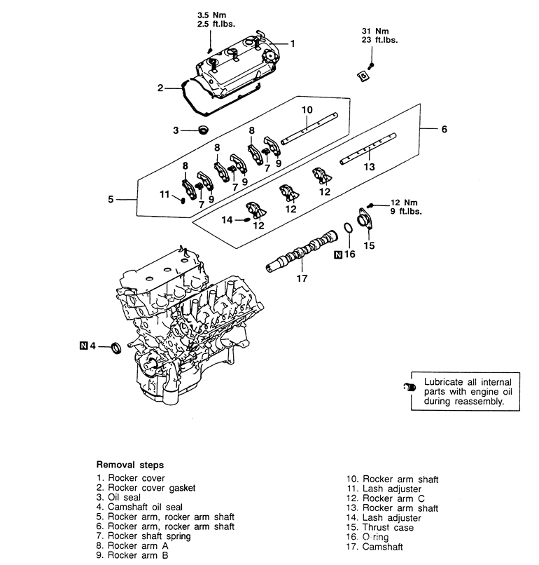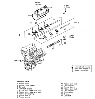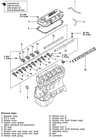 NOTE: Be sure to note the position of the rocker arms, rocker shafts and bearing caps for reinstallation purposes.