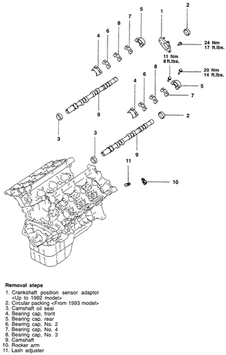| Fig. 9: Camshaft, rocker arm and shaft assemblies — 3.0L DOHC engine |