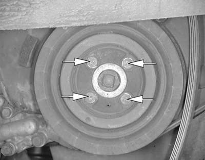 Fig. 2: Unfasten the crankshaft pulley retaining bolts, then remove the pulley