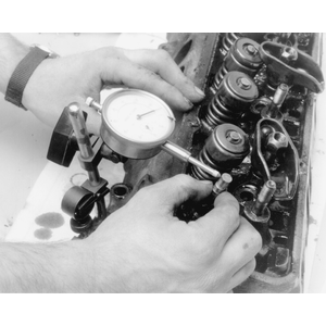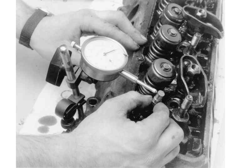 | Fig. 5: A dial gauge may be used to check valve stem-to-guide clearance; read the gauge while moving the valve stem |