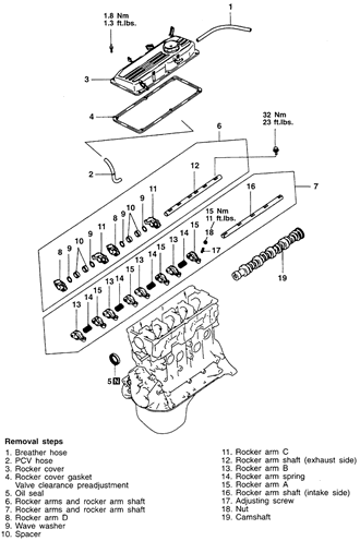 - Loosen both rocker arm shaft assemblies gradually and evenly and remove