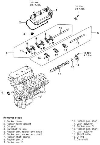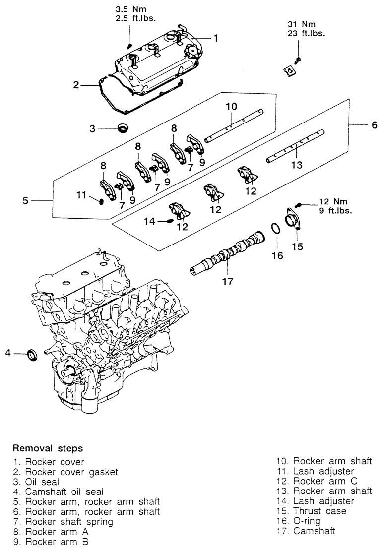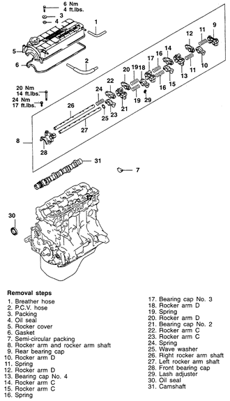 - Remove the rocker arms, shafts and bearing caps as an assembly.