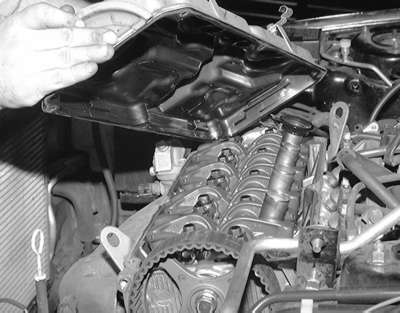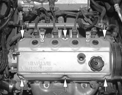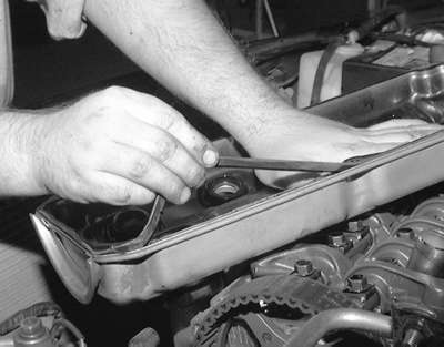 | Fig. 8: Remove the valve cover retaining bolts . . .