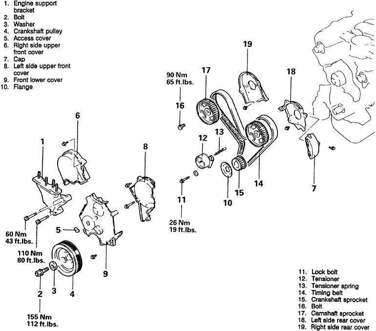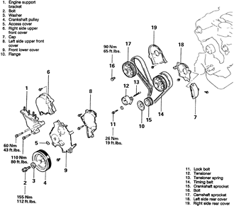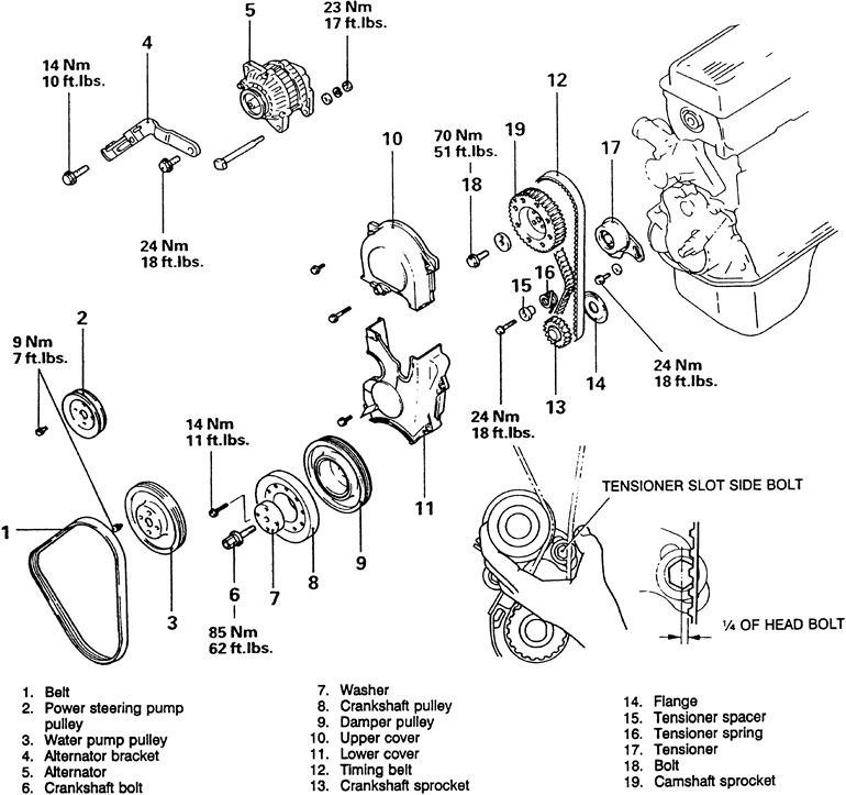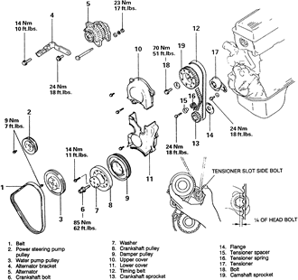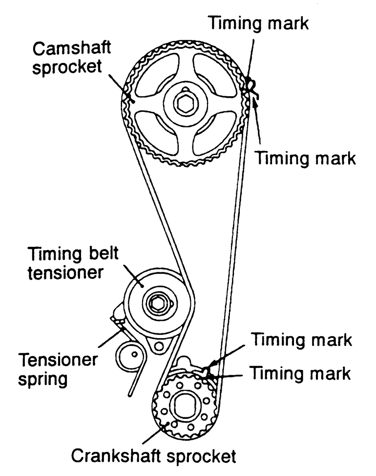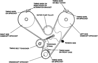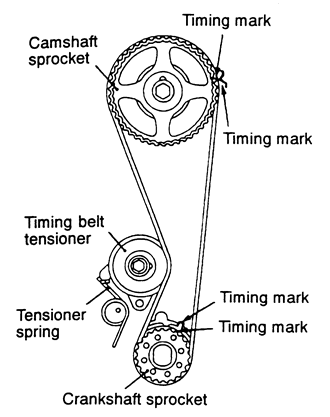 NOTE: If coolant or engine oil comes in contact with the timing belt, they will drastically shorten its life. Also, do not allow engine oil or coolant to contact the timing belt sprockets or tensioner assembly.