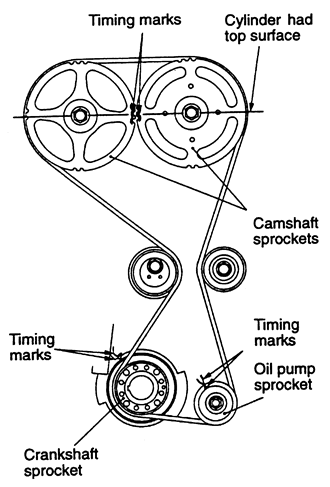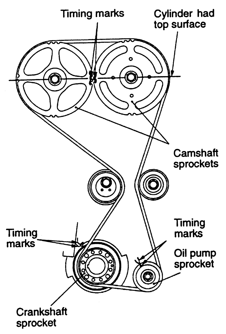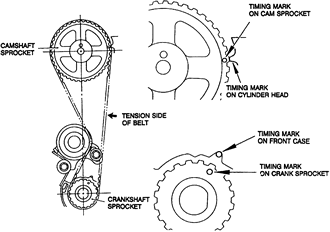 | Fig. 5: Camshaft and crankshaft sprocket alignment for proper timing belt replacement — 1.8L and 2.0L SOHC engines |