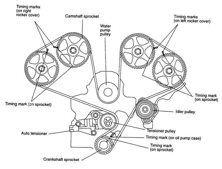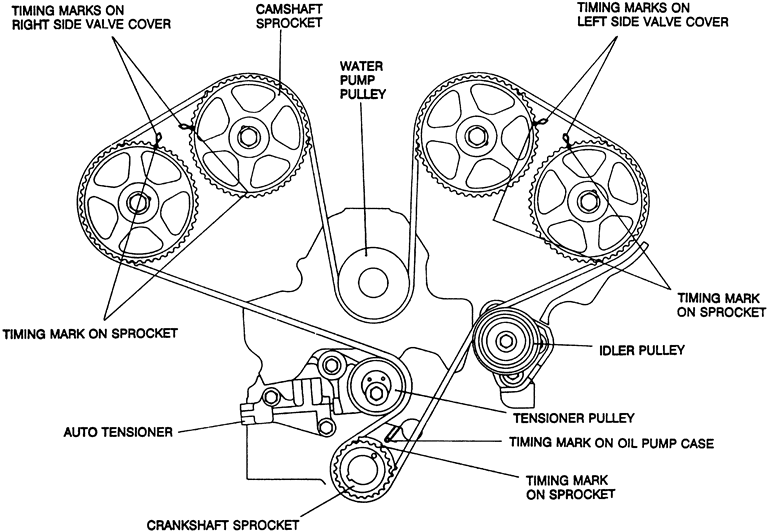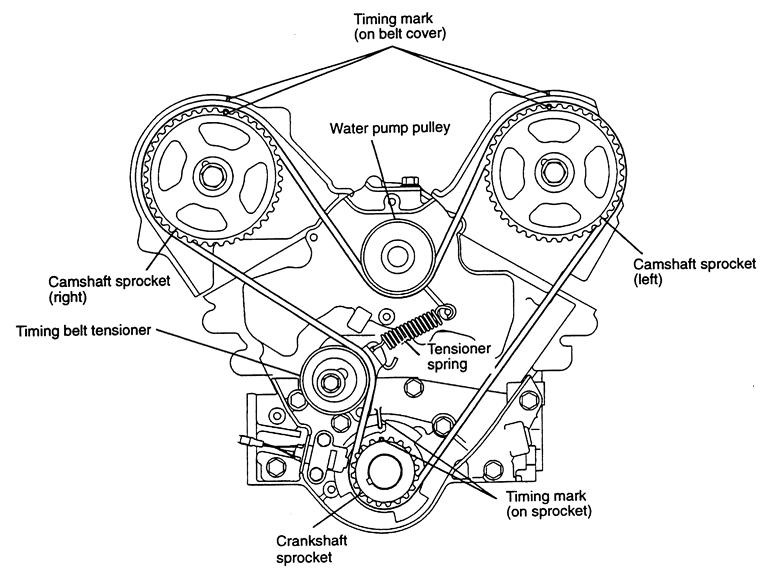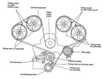| Fig. 31: Crankshaft and camshaft sprocket alignment for proper timing belt replacement — 1992–94 Mitsubishi 3.0L DOHC engine |