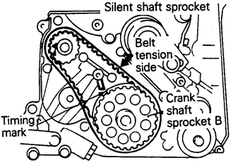 | Fig. 26: Silent shaft alignment marks. Notice the tension side of the inner (silent shaft) belt — 2.4L engine |