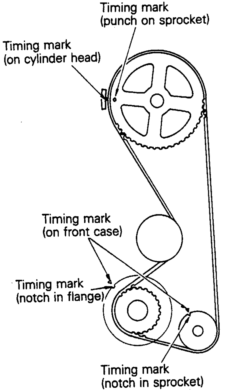 NOTE: If the same timing belt will be reused, mark the direction of timing belt's rotation, for installation in the same direction. Be sure engine is positioned so No. 1 cylinder is at the TDC of it's compression stroke and the sprockets timing marks are aligned with the engine's timing mark indicators.