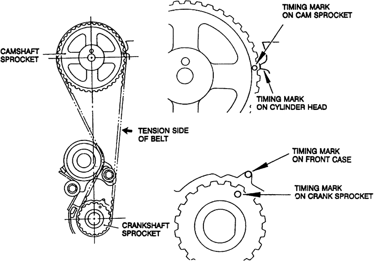 | Fig. 2: Camshaft and crankshaft sprocket mark alignment for proper timing belt installation — 1990–94 1.5L engine |