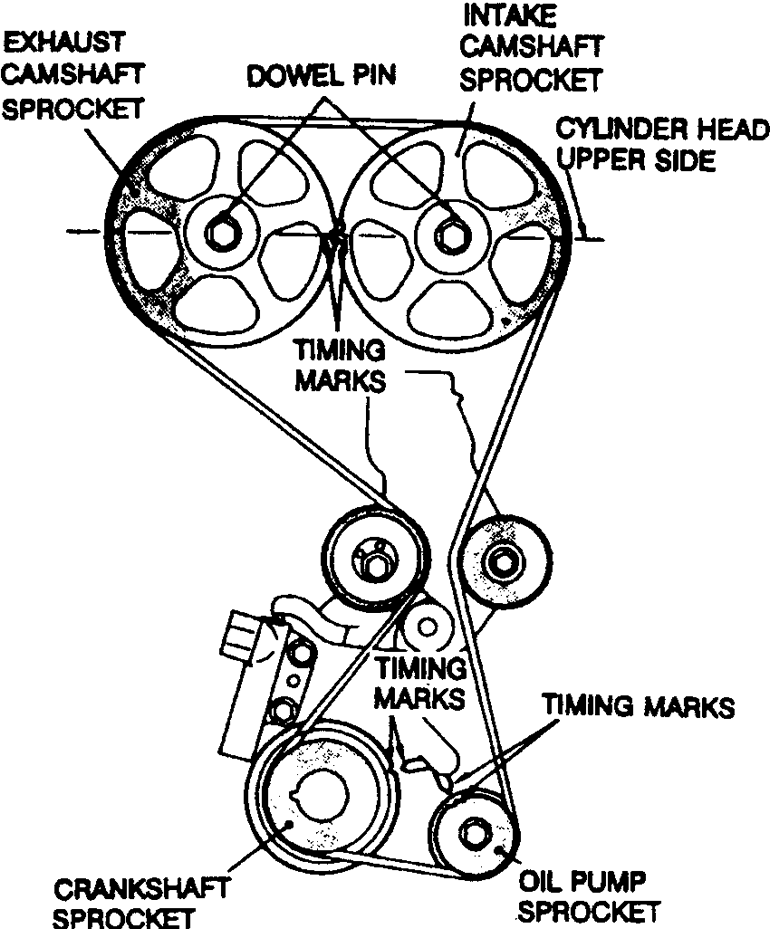 | Fig. 4: Camshaft and crankshaft timing belt sprocket alignment marks — 1990–94 Mitsubishi 1.6L and 2.0L DOHC engines |