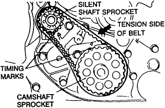 | Fig. 6: Silent shaft sprocket alignment marks for belt replacement — 1.8L and 2.0L SOHC engines |
